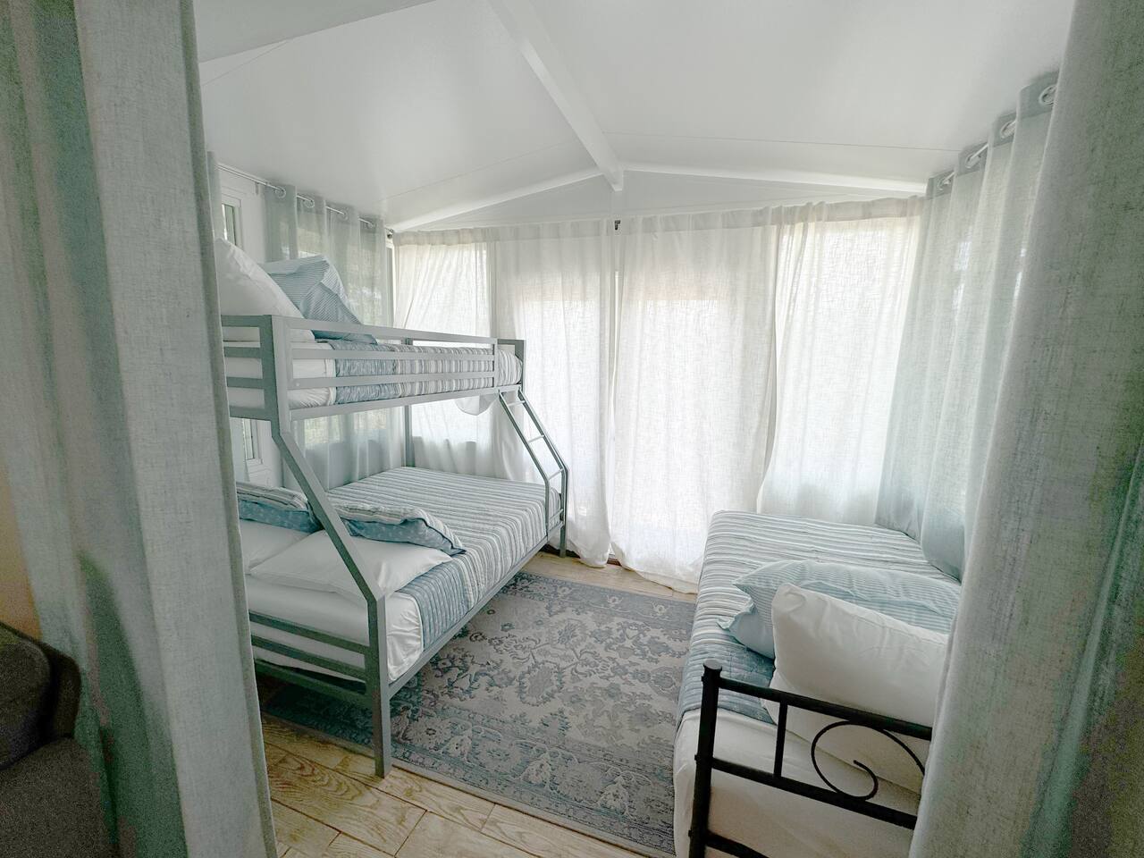 3rd "bonus" bedroom is a converted sun-room. It does not have a door and has only limited privacy by using curtains. This is necessary for the airflow and comfortable temperature.