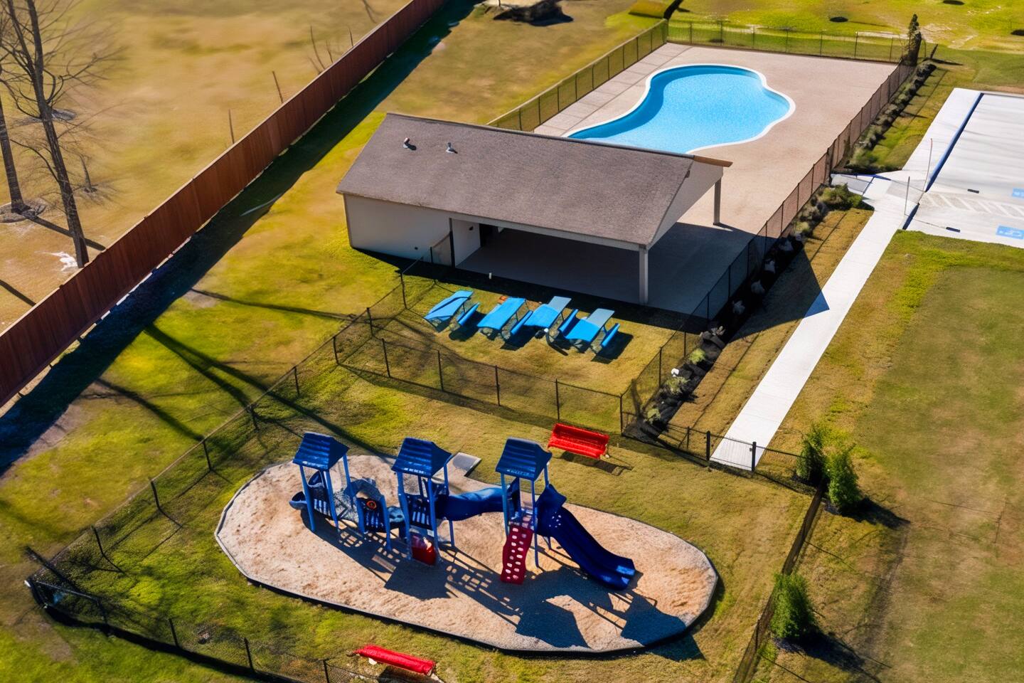 It's a 4 bedroom with 4 king beds and a game room with a fire pit and a grill and community playground and a pool to enjoy for even a large family